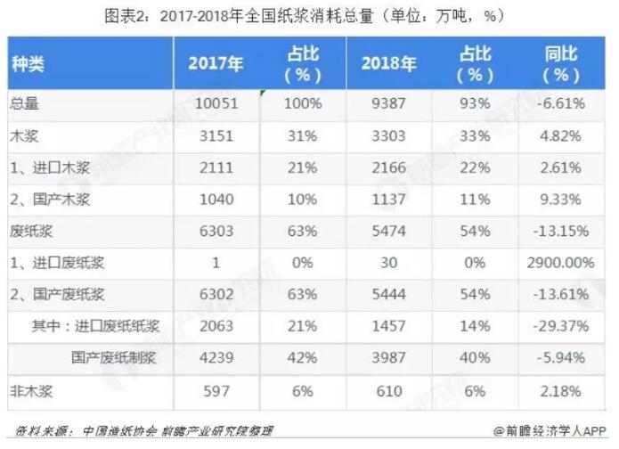 而2018年全國紙漿消耗總量9387萬噸,較上年增長-6.61%。木漿3303萬噸,占紙漿消耗總量35%,其中進口木漿占23%、國產木漿占12%;廢紙漿5474萬噸,占紙漿消耗總量58%,其中用進口廢紙制漿占16%、用國產廢紙制漿占42%;非木漿610萬噸,占紙漿消耗總量7%。