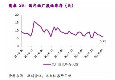 原料市場供應不足,企業庫存處于低位,但造紙廠仍然一意堅持下調廢紙降價。造紙廠在原料庫存枯竭的邊緣瘋狂試探。 繼8月1日玖龍、理文下調成品紙價格以后,廢紙價格也迎來一波大面積下調。根據“紙箱查查”廢紙價格數據,僅8月3日當天就有61家紙廠集體下調廢紙價。 從2017年的“屯黃金不如囤廢紙”,到現在囤多少賠多少,廢紙真的徹底跌落塵埃了嗎? 吊詭情形:造紙廠原料庫存創新低 而從2019年開春以來,造紙廠的廢紙庫存天數就一直在下降。今年6月份,國內紙廠廢紙天數繼續下降,為 5.75 天,同比下跌 9%。和歷史同期比,造紙廠廢紙庫存天數也是處于較低水平。