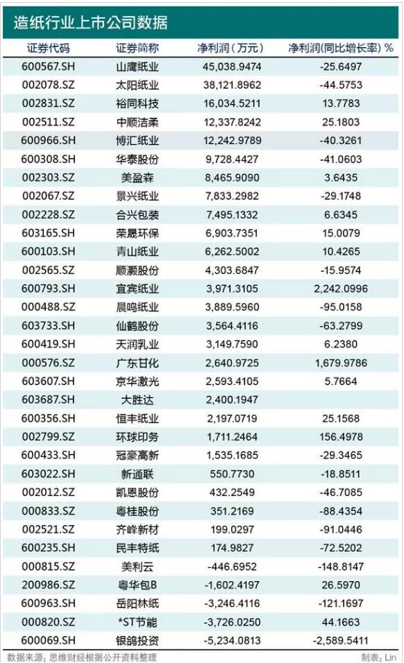 面對如此情況,不得不令人疑惑,這到底是怎么了? 2、凈利潤普遍下滑,紙張價格較去年同期大幅降低 先看在一個月內跌幅逾20%的理文造紙。根據公司發布的2019年中期業績報告數據顯示,其營業收入為129.47億港元,同比下跌20.9%;毛利23.37億港元,同比下跌43.3%;公司擁有人應占期內盈利16.8億港元,同比下跌43.6%。受營收凈利雙降的利空消息刺激,其中在8月15日當天還跌出最低價3.96港元,截至8月16日的總市值為183億港元。 就此,理文造紙在財報中表示,2019年上半年,受供給側改革等因素影響,造紙行業面臨著一定的挑戰和調整,理文造紙穩中有緩,上半年銷售量及利潤均有所下降,不過均在集團預期之內,集團戰略目標保持不變。 事實上,除理文造紙以外,其他造紙業上市公司的情況也并不好過。 再看全國惟一一家A、B、H三種股票上市公司的晨鳴紙業8月15日也披露了半年報。數據顯示,上半年公司完成機制紙產量215萬噸、銷量239萬噸,營業收入133.49億元,同比降低14.16%;歸屬于母公司所有者的凈利潤為5.1億元,同比下降71.43%。 對此晨鳴紙業也表示,受宏觀經濟形勢的影響,造紙行業整體景氣度不高,紙張價格較去年同期大幅降低,尤其是一季度業績不理想,導致上半年經營利潤較去年同期下降。 另外,此前宜賓紙業發布公告稱,預計上半年凈利潤約1600萬元,比上年同期下降92.65%。公司扣非凈利預計虧損約8000萬元,上年同期虧損303.9萬元。而對于業績下滑,其在財報中表示,上半年,國內造紙市場持續低迷,需求下降,導致紙張價格下降較大。此外,報告期內確認搬遷補償金額為0.93億元,也與上年同期相比減少約1.17億元。 3、利潤總額同比下降30%,造紙業到底怎么了? 由上可看出,今年上半年以來,造紙行業的上市公司經營狀況并不理想。那么,整個造紙行業的情況又是如何呢? 根據國家統計局公布的數據顯示,今年1-5月份,在41個工業大類行業中26個行業利潤總額同比增加,15個行業減少。其中,造紙和紙制品行業1-5月營業收入為5410.1億元,同比減少1.2%,利潤總額為221.5億元,同比減少30.3%。印刷和記錄媒介復制業1-5月營業收入為2475.2億元,同比增加2.5%,利潤總額為145億元,同比增加5.7%。 隨著國家對環境治理的不斷深入,造紙企業成為重點關注對象,重污染的小型紙廠被迫退出市場,不少造紙企業出現虧損。根據中商產業研究院監測數據顯示,2018年造紙企業6704家,虧損企業1045家,同比增長23.5%,虧損面15.6%,較2017年有所擴大。同時造紙企業虧損規模也有所擴大,2018年造紙企業虧損80億元,同比增長58.3%。 2018年中國造紙企業主營業務營收13727.9億元,同比增長8.3%。雖然,不少造紙企業因環保而破產,但是中國造紙企業集中度提升,大型造紙企業主營業務營收增長,從而帶動整個行業主營業務營收攀升。 前瞻產業研究院數據顯示,2018年包裝用紙生產量690萬噸,較上年增長-0.72%;消費量701萬噸,較上年增長-0.85%。2009~2018年生產量年均增長率2.05%,消費量年均增長率1.99%。 從產能方面的數據來看,包裝用紙行業產能前四的公司分別是玖龍紙業、理文造紙、博匯紙業和山鷹紙業。其中,玖龍紙業、理文造紙在港股上市,是目前國內造紙行業規模最大的兩家公司;博匯紙業和山鷹紙業在A股上市。玖龍紙業目前有約1335萬噸包裝用紙產能,公司在廣東東莞、重慶、天津等地均有設廠,產能在全國范圍內布局十分廣泛,牢牢占據包裝用紙行業的龍頭地位。而位居第二的理文造紙,也有將近700萬噸包裝用紙產能。根據2018年各公司的產能數據測算,包裝用紙行業的CR4僅為30.23%,CR8也僅為38.92%,行業集中度較低。 前瞻產業研究院認為,經過環保去產能,部分中小落后產能被淘汰,行業集中度有所提升,而隨著行業龍頭逐漸開始擴產能,造紙行業的集中度有望進一步提升。 4、未來造紙行業的投資價值又到底如何? 如此一來,未來造紙行業的投資價值又到底如何? 中商產業研究院表示,近幾年,我國造紙行業在黃金十年(2000年-2010年)階段所積累的一些問題開始集中爆發,比如原材料進口依賴度高,產品結構不均衡,高端紙品依賴進口,國內廢紙回收系統不完善等問題。2018年造紙行業受到環保持續趨嚴、原料供給受限等因素影響。內憂外患之下,眾多造紙企業加速淘汰落后產能,開始紛紛布局海外產能,同時,造紙企業紛紛通過向上下游的延伸,向產業鏈一體化方向發展,以實現從源頭控制原材料降低成本,開拓包裝業務緩解需求受市場波動影響程度。 2019年雖然外部環境還存在諸多不確定因素,因此造紙產業依舊會是挑戰與機遇并存的一年。2019年造紙行業或延續行業低迷態勢。造紙行業整體形勢不容樂觀,這波嚴峻考驗就像大浪淘沙,具備優勢的“剩”者才能為王。 國家統計局則認為,雖說當前整個造紙及紙制品行業運行情況不甚樂觀,但是,我們從其他信息中心又可以看出,造紙行業在整個輕工業中的競爭力還是很強的。 6月25日,2019中國輕工業百強企業名單發布,玖龍紙業、晨鳴紙業、華泰集團、山鷹國際、太陽控股、理文造紙、亞太森博、博匯集團、中國紙業投資、金海漿紙等10家企業被評為中國造紙行業十強企業。中國造紙企業競爭優勢明顯,6家造紙企業進入中國輕工業百強企業前二十強之列。 此外,從國家統計局的行業景氣指數來看,僅2009年我國造紙及紙制品行業景氣指數低于100,處于不景氣狀態;2010年以來我國造紙及紙制品行業景氣指