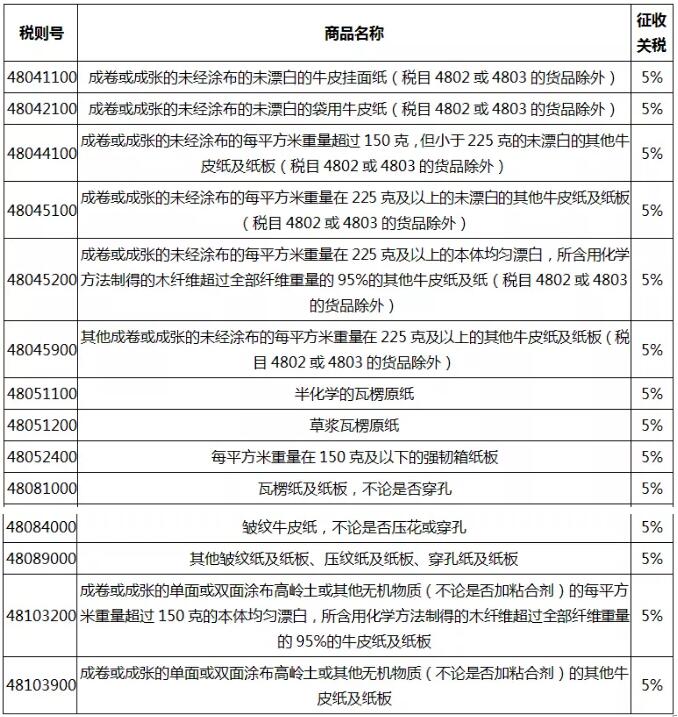 此外,9月1日及12月15日加征關(guān)稅的名單中,還涉及與6月1日重復(fù)加稅的48043100和48044900兩個稅則號。兩個稅則號6月份關(guān)稅為20%,9月份加征關(guān)稅10%,總關(guān)稅為32%。