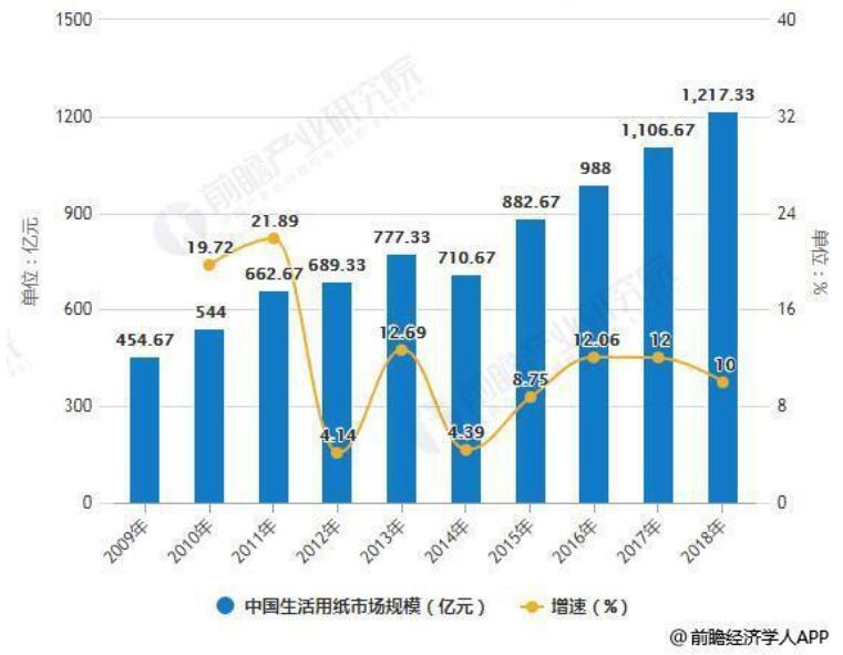 生活用紙?jiān)鏊僮羁飚a(chǎn)品結(jié)構(gòu)也會(huì)逐漸調(diào)整 生活用紙因其剛需消費(fèi)屬性,市場需求明顯優(yōu)于其他紙種。在快速消費(fèi)品中格局又顯著優(yōu)于其他品類。成本端,漿價(jià)見頂利好生活用紙企業(yè)成本壓力釋放。目前在整個(gè)紙與紙制品中,生活用紙的增速最快,同時(shí)隨著消費(fèi)升級(jí),中國的生活用紙將持續(xù)增加,產(chǎn)品結(jié)構(gòu)也會(huì)逐漸調(diào)整。 生活用紙成為造紙行業(yè)的主要增長極 行業(yè)規(guī)模上,我國2009年生活用紙市場規(guī)模為454.67億元,2017年市場規(guī)模擴(kuò)大至1106.33億元,年復(fù)合增長率為11.8%。市場規(guī)模增速大于消費(fèi)量增速同時(shí)暗示了單價(jià)的同步提升。同時(shí),基于我國生活用紙人均用量與發(fā)達(dá)國家的差距及宏觀經(jīng)濟(jì)發(fā)展對(duì)人均用量提升的助力,生活用紙市場擴(kuò)容趨勢(shì)有望得以延續(xù)。’ 2009-2018年中國生活用紙市場規(guī)模統(tǒng)計(jì)及增長情況