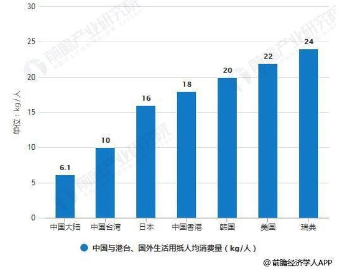 數(shù)據(jù)來源:前瞻產(chǎn)業(yè)研究院整理 國內(nèi)生活用紙行業(yè)仍有較大提升空間 同時(shí),隨著經(jīng)濟(jì)的發(fā)展及消費(fèi)水平提升,國內(nèi)生活用紙人均消費(fèi)量由2009年的2.1kg/人上升至2017年的6.1kg/人,但對(duì)比港臺(tái)及國外水平(臺(tái)灣10kg/人,日本16kg/人,香港18kg/人,韓國20kg/人,美國22kg/人,瑞典24kg/人),仍有較大提升空間。 中國與港臺(tái)、國外生活用紙人均消費(fèi)量對(duì)比情況