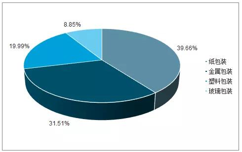 2018-2023年包裝行業銷售收入及預測 中國包裝市場合計營收9433.74億元,紙和紙板制造占比39.66% 目前,中國市場上應用最廣泛的是紙質包裝和塑料包裝產品,其次是金屬包裝和玻璃包裝。 據調查數據統計顯示,紙包裝、塑料包裝、金屬包裝和玻璃包裝合計實現營業收入9433.74億元,紙和紙板制造占整個包裝主營業務收入的39.66%。 中國包裝行業細分市場營銷占比