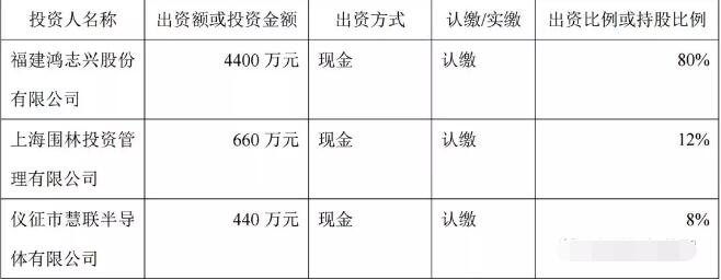 在擬設立的控股子公司中,福建鴻志興股份有限公司認繳出資4400萬元,占注冊資本比例80%,上海圍林投資管理有限公司認繳出資660萬元,占注冊資本比例12%,儀征市慧聯半導體有限公司認繳出資440萬元,占注冊資本比例8%。具體以工商審核為準。