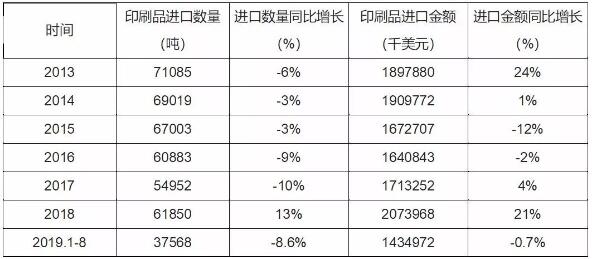 2013-2019年8月中國印刷品進口數量及進口金額統計表