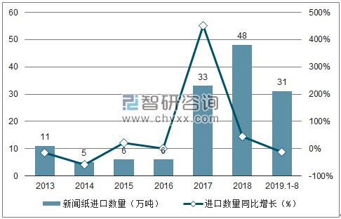 2013-2019年8月中國新聞紙進口數量趨勢圖