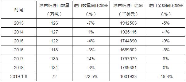 根據中國海關數據顯示:2019年1-8月中國涂布紙進口數量為72萬噸,同比下降22.5%;2019年1-8月中國涂布紙進口金額為1001933千美元,同比下降19.8%。