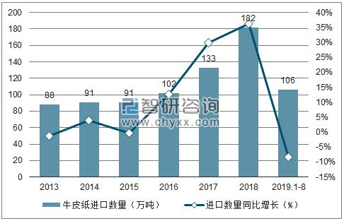2013-2019年8月中國牛皮紙進口數量趨勢圖