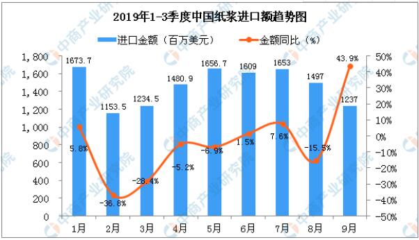 從金額方面來看,2019年9月中國紙漿進口金額為1237百萬美元,同比增長43.9%。