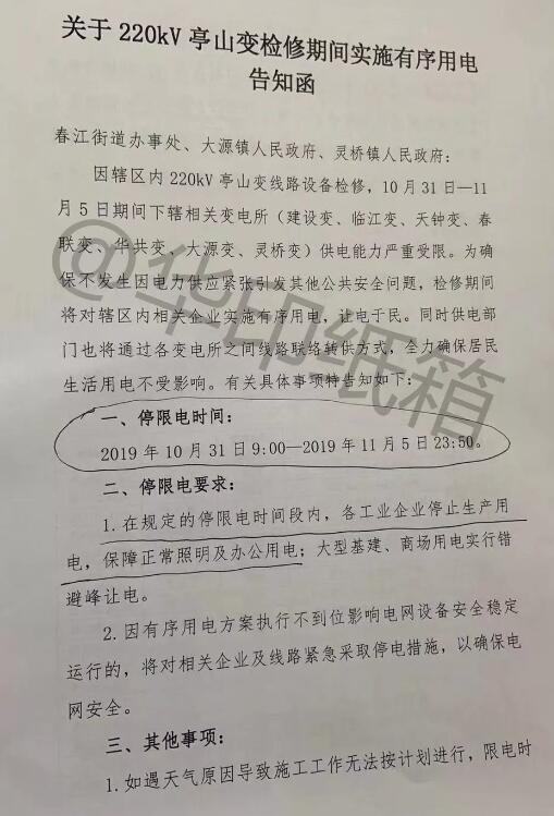 導語:因供電設備進行大檢修,浙江富陽35家造紙廠再次被迫停限產,時間將近1周。此外,據卓創造紙調研,今年浙江省繼續推進造紙改造升級,年初已關停白板紙產能達100多萬噸,2020年春節前將繼續關停100多萬噸,預計2019年中國白板紙產量將近900萬噸。2020年浙江省將繼續關停150萬噸白板紙產能,預計2020年白板紙產量800萬噸左右。這意味著,2020年浙江還有250萬噸白板紙產能將被清退!一場行業洗牌已經來臨! 供電設備檢修,富陽35家造紙廠被迫停限產近一周 近日,浙江省富陽區春江街道、大源鎮、靈橋鎮的造紙企業又被無奈停限產了!根據官方文件通知,原因是:因轄區內220KV亭山變線路設備檢修,10月31日-11月5日期間下轄相關變電所供電能力嚴重受限,為確保不發生因電力供應緊張引發其他公共安全問題,檢修期間將對轄區內相關企業實施有序用電,讓電于民。 一、停限電時間:2019年10月31日9:00-11月5日23:50 二、停限電要求: 1、在規定的停限電時間內,各工業企業停止生產用電,保障正常照明及辦公用電。 2、因有序用電方案執行不到位影響電網設備安全穩定運行的,將對相關企業及線路緊急采取停電措施。