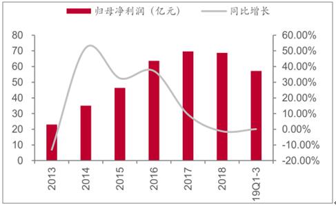 包裝印刷是以各種包裝材料為載體的印刷,在包裝上印上裝飾性花紋,圖案或者文字,以此來使產品更有吸引力或更具說明性,從而起到傳遞信息,增加銷量的作用。按包裝材料分類,包裝行業(yè)可分為紙包裝、金屬包裝、塑料包裝、玻璃包裝等細分子行業(yè)。 包裝印刷需顧及到經濟型,環(huán)保性等問題,并需要同時能夠完整,良好地表達需要印刷的信息。從產業(yè)鏈來看,包裝印刷行業(yè)的上游主要是紙、塑料、油墨及添加劑等原材料和設備制造業(yè),下游銜接卷煙、電子、食品飲料、藥品等行業(yè)。 2019年前三季度包裝板塊實現(xiàn)主營業(yè)務收入707億元,同比增長7.3%;實現(xiàn)歸母凈利潤57億元,同比上升0.1%。分季度看,板塊營收Q1/Q2/Q3分別同比增長8%/下滑0.4%/增長5.78%,歸母凈利潤分別同比增長9.9%/下滑15.1%/增長6.3%。 2013-2019Q1-3包裝印刷板塊營收規(guī)模及增速趨勢