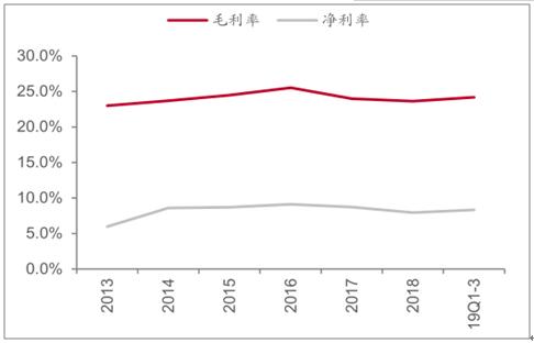 數(shù)據(jù)來源:公開資料整理 2019前三季度包裝板塊毛利率24.2%,同比提升0.9pct;凈利率8.3%,同比下降0.9pct。費用率方面,銷售費用率4.53%,同比提升0.3pct;管理費用(含研發(fā)費用)率8.3%,同比提升1pct;財務費用率1.5%,同比提升0.1pct。 包裝印刷板塊整體毛利率和凈利率