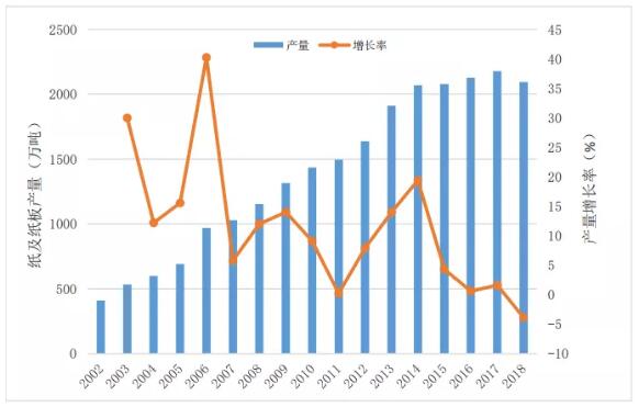 2018紙及紙板產量出現近十年來首次下降 2018年,全國紙及紙板產量達10435萬噸,同比下降6.24%。其中,廣東省紙及紙板產量 2094.55萬噸,同比下降3.9%,占全國紙及紙板產量20.1%。全國和廣東省紙及紙板產量雙雙出現下滑,這也是近十年來從未出現的現象。