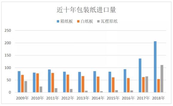(瓦楞紙價格走勢) 目前國產廢紙價格高企在2000元/噸,且政府執行“煤改氣”等政策,企業燃煤鍋爐改為燃燒天然氣,運行成本將上漲300-500 元/噸,包裝紙生產企業幾乎無利潤或虧損運營。 同時,不少包裝印刷企業為了降低成本,從國外采購包裝紙原紙。2017年-2018年,包裝紙進口量大幅增長,2018年,全國進口箱紙板207萬噸,同比增長51.1%;進口瓦楞原紙111萬噸,同比增長70.8%。2019年1-6 月,全國進口瓦楞原紙64萬噸,同比增長52%。