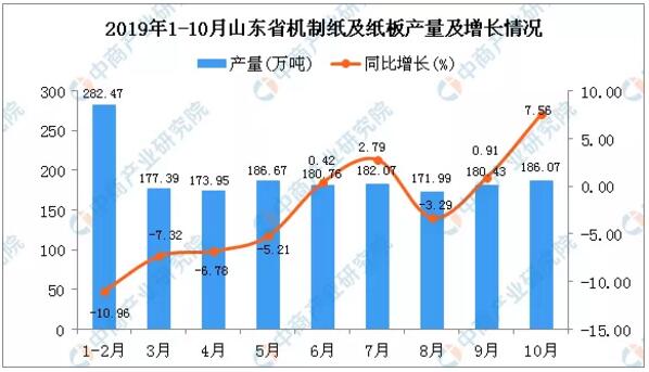 2019年1-10月山東省機(jī)制紙及紙板產(chǎn)量及增長(zhǎng)情況