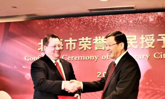 12月4日下午,斯道拉恩索集團(tuán)消費紙板中國區(qū)高級副總裁葉萬霆(Pentti Ilmasti)因?qū)Ρ焙J薪?jīng)濟(jì)及社會的突出貢獻(xiàn)被授予“北海市榮譽市民”稱號。授予儀式在北海香格里拉大酒店舉行。北海市市長蔡錦軍出席儀式,并向葉萬霆頒發(fā)“北海市榮譽市民”證書。