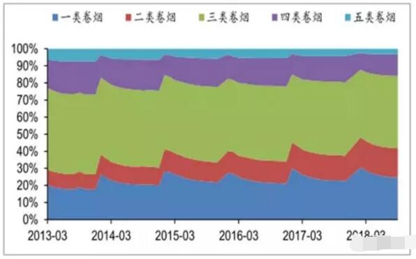 ▲全國卷煙工商業庫存變化(萬箱) 下游煙草產品結構變化,中高端、創新產品占比提升。2016年,煙草銷量下滑中,經典款銷量增長動力略顯不足。以高端卷煙“中華”品牌為例,“中華”香煙2016年銷量134.97萬箱,同比減少18.46萬箱,下滑約12%。主要原因是新品大量發布、提稅順價過程中,經典品牌的配套維護措施不到位。2017年,煙草公司前期發布的新品逐步取得成效,同時創新產品貢獻增量。配合去庫存的階段性成果,產品結構優化轉變推動了2017-2018年煙草行業銷量的回暖。 新品推出力度加強:根據中國煙草總公司披露的數據,自2012年至2017年7月,煙草行業供給上市615款新品。其中,2016、2017年分別上市171個、148個新品,相比于2012-2015的年均新品上市數實現翻番。 新品中高端化:根據中國煙草總公司披露的數據,2012年至2017年7月,上市新品多集中在中一類、普一類、二類等價區,數量分別是155、126、140個。此外,超一類價區新品(每條零售價近千元)數量達到72個。(1)我國煙草銷量結構中,一類、二類煙占比不斷提升。截止2018年9月,一、二類煙占比25%、17%,而2013年9月一、二類煙占比僅有18%、9%。(2)煙草每箱銷售單價也在不斷提升,2013年箱均2.5萬元左右逐年提升至3萬元以上。