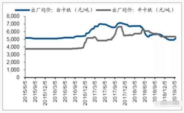 ▲中國貿易出口金額(累計值) 成本處于低位利潤彈性的邏輯依然成立,預計各紙包裝公司盈利能力會有同比提升。各類紙品紙價有所下滑,其中白卡紙下滑幅度較為顯著。目前國內白卡紙出廠均價5100元/噸左右,遠低于去年年初6700元/噸的高價,上游成本下降不會快速全部傳導到下游定價,包裝類公司有望享受到其中一部分的利潤價值。