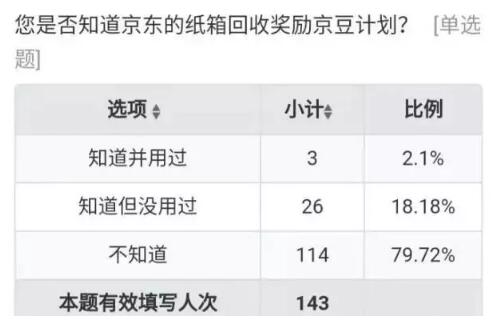有站點負責人表示,回收的紙箱他們一般當天寄件就會消化,“紙箱的用戶回收率大約在20%-30%。我們不會主動提示用戶回收,怕影響派件速度。” 11月18日,京東物流推出“環保來敲門”行動。在用戶收到的京東快遞上,貼了一個綠色封條,上面印有“包裝回收再用,共同助力環保”的字樣。京東小哥在送貨上門時,可將用戶閑置的紙箱回收,并獎勵一定京豆。然而,快遞小哥幾乎也不會做任何提示。 在143位問卷受訪者中,只有3位知道并使用過京東的紙箱回收,近80%表示從未聽說過該計劃。