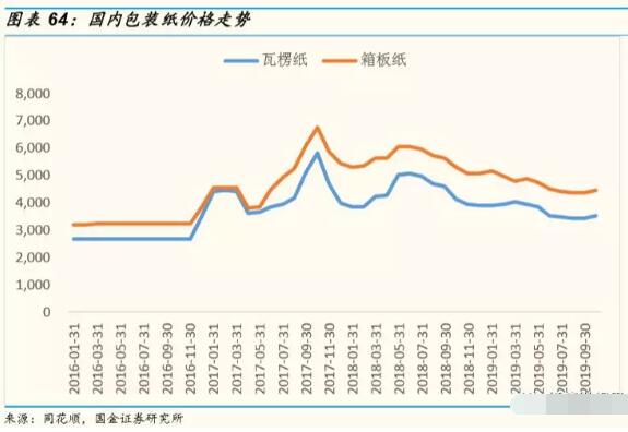 2)木漿造紙:目前來看,無論是國內漿價還是國際漿價都處在相對低位。但與廢紙相比木漿價格明顯更高。若采用木漿進行包裝紙制造,在激發木漿需求的同時,也將會導致成本增加促使原紙漲價。