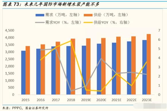 長期而言,根據PPPC統計數據,預計今年全球闊葉漿供給量為3,957萬噸,同比微增0.51%,需求量為3,432萬噸,同比增長0.95%。 未來4年,預計全球闊葉漿新增產能為291萬噸,而新增需求為391萬噸。另一方面,根據Bloomberg統計數據顯示,預計明年全球新增木漿產能僅130萬噸。 綜合來看,未來全球木漿新增產能不多,且一定程度上需求增長快于產能增長。因此,中長期看,木漿價格具備溫性上漲基礎。