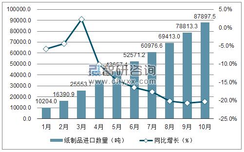 根據中國海關數據顯示:2019年1-10月紙制品進口數量為87897.5噸,同比下降20.3%;2019年1-10月紙制品進口金額為50152.3萬美元,同比下降13.9%。