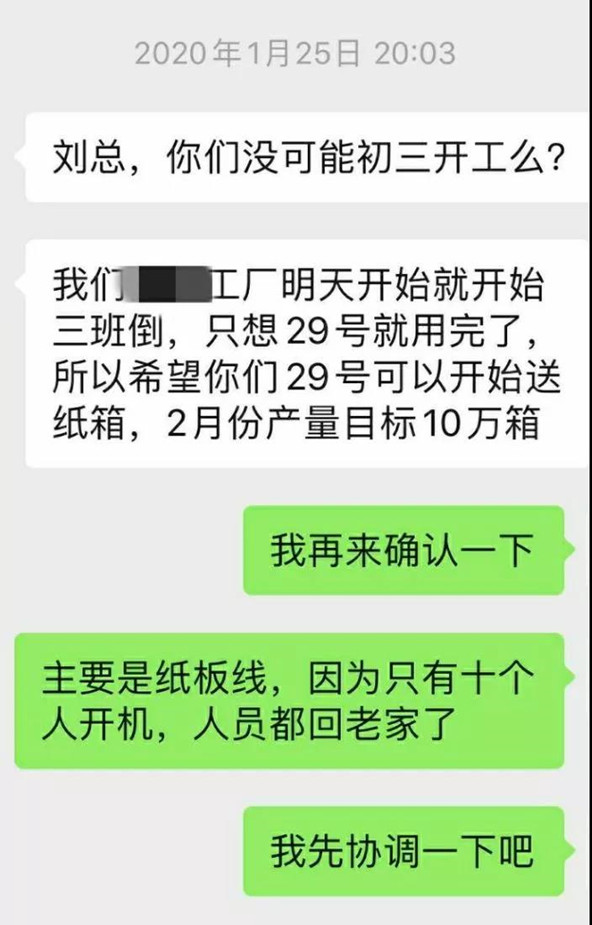 大年初一:客戶告急,萬國應(yīng)急響應(yīng) 大年初一,醫(yī)藥客戶通知其將于1.27日(正月初三)由原先的一條生產(chǎn)線緊急調(diào)整為3條生產(chǎn)線生產(chǎn),紙箱庫存告急。 責(zé)任重于泰山,在全國新型冠狀病肺炎防控關(guān)鍵階段,我們有責(zé)任和義務(wù)在此刻配合醫(yī)藥企業(yè),完成疫情所需藥品生產(chǎn)任務(wù),提供配套服務(wù),我司領(lǐng)導(dǎo)班子積極行動,成立包括總經(jīng)理、生產(chǎn)副總、銷售副總、以及工藝部、采購部、設(shè)計部、銷售負(fù)責(zé)人在內(nèi)的醫(yī)藥紙箱應(yīng)急響應(yīng)群,希望調(diào)動公司一切資源配合客戶的供貨。 正月初二:緊急調(diào)動生產(chǎn)人員,及時采購防控物資 由于公司多為外地員工,新春佳節(jié),大家都已回老家團(tuán)聚,蘇州當(dāng)?shù)刂挥幸蝗肆羰亍Ia(chǎn)副總李紅俊制定人員緊急預(yù)案,及時聯(lián)系可到位生產(chǎn)人員,并發(fā)動非湖北籍關(guān)鍵崗位員工,是否有自愿來公司支援生產(chǎn)。 人事經(jīng)理吉花冒雨奔走各大藥店采購防控物資,送到公司,為復(fù)工做前期準(zhǔn)備工作。 正月初三:蘇州市園區(qū)政府批準(zhǔn)復(fù)工 客戶給公司開了證明,管理層積極聯(lián)絡(luò)政府人員申請復(fù)工,征得當(dāng)?shù)卣鷾?zhǔn)。 正月初四:順利復(fù)工 致敬這些可愛又可敬的萬國同事們,接到工廠臨時通知后,舍棄春節(jié)休假時間。非湖北籍員工在確保體溫正常的情況下連夜從外地趕回,從而保證產(chǎn)線順利開展。