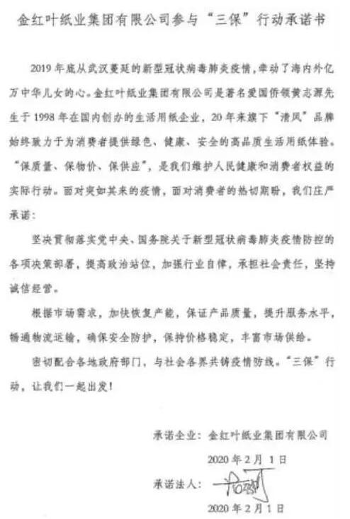 志愿者們的積極行動,展現出對抗擊疫情的決心,也得到客戶的高度好評。 服務客戶,響應“三保” 秉持誠信,堅定維護消費者權益。疫情當前,金紅葉集團始終關注客戶需求,在特殊時期,金紅葉積極參與“三保”行動,即“保質量、保物價、保供應”,維護人民健康和消費者權益。面向消費者的熱切期盼,承諾將根據市場需求,加快恢復產能,保證產品質量,提升服務水平,暢通物流運輸,確保安全防護,保持價格穩定,豐富市場供給。同時密切配合各地政府部門,與社會各界共鑄疫情防線。