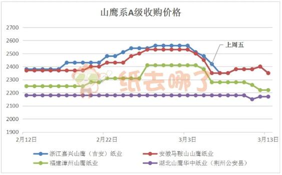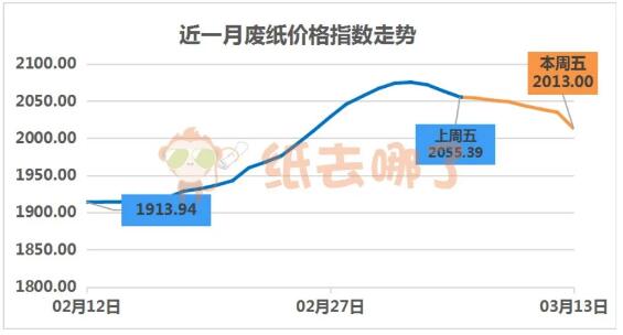 上周,廢紙價(jià)格“大跳水”,降價(jià)的范圍、幅度越來(lái)越大,甚至出現(xiàn)一日多次降價(jià)的情況。幾家大廠更是一馬當(dāng)先,領(lǐng)頭降價(jià)。截至3月13日(上周五)上午,廢紙價(jià)格指數(shù)為2013.00點(diǎn),相比前一周周五的2055.39點(diǎn),下跌42.39點(diǎn)。 02、山鷹系A(chǔ)級(jí)收購(gòu)價(jià)格走勢(shì)