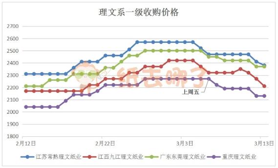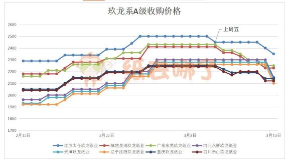 上周理文系一級(jí)紙收購(gòu)價(jià)格下跌,幾家理文均多次下調(diào)紙價(jià)。截至3月13日上午,江蘇、江西、廣東、重慶理文總體上分別下調(diào)90、110、80、140元/噸。理文系一級(jí)紙以江蘇理文最高,為2380元/噸;重慶理文最低,為2130元/噸。 04、玖龍系A(chǔ)級(jí)收購(gòu)價(jià)格走勢(shì)