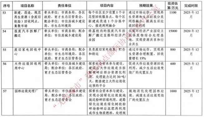 三亞市“無廢城市”工程建設項目清單及進度安排(部分)。資料來源:三亞市“無廢城市”建設試點實施方案 重慶市表示,將建立多元化、多層次的資金投入保障體系。市級財政落實市級層面“無廢城市”建設試點工作經費保障,將相關經費納入預算。市級有關部門對接國家部委,爭取國家資金支持。重慶市主城區政府(管委會)加強“無廢城市”建設試點工作的資金投入,結合生活垃圾收運處理設施、污水污泥處置設施、建筑垃圾消納設施等重點工程建設,加大財政資金統籌整合力度。創新重點領域固體廢物投融資機制,建立循環經濟融資平臺,加強政、銀、企信息對接,引導和鼓勵社會資本加大對固體廢物處理處置設施投入力度。 北京經濟技術開發區的方案則提出,到2025年,開發區“無廢城市”建設模式在“亦莊新城”范圍內全面鋪開,落地一批先進的固體廢物處理工程設施,基本實現依靠區內基礎設施處理處置固體廢物問題,初步實現園區趨零排放。創新融資方式,支持社會資本參與、發行綠色債券,擴展綠色發展資金項目等,用于支持固體廢物源頭減量、資源化利用和安全處置體系建設。 根據紹興市的方案,該市將重點培育一批市級綠色工廠和綠色園區,持續打造一批綠色設計產品。2020年12月底前,累計實施國家級綠色制造系統集成項目、創建國家級綠色制造名單15個以上;創建市級以上綠色工廠49家;創建市級以上綠色園區、循環化改造園區8家。以動力電池、電器電子產品、汽車、鉛酸蓄電池等為重點,落實生產者責任延伸制,到2020年12月底,基本建成廢棄產品逆向回收體系。 在要素投入方面,紹興市表示,將加強財政資金統籌整合,明確“無廢城市”建設試點資金范圍和規模。將固體廢物分類收集及無害化處置設施納入城市基礎設施和公共設施范圍,保障設施用地。鼓勵金融機構在風險可控前提下,加大對“無廢城市”建設試點的金融支持力度。建立紹興市“無廢城市”技術支撐服務專家庫。 “無廢”最高境界是實現生命輪回 《“十三五”全國城鎮生活垃圾無害化處理設施建設規劃》提出,“十三五”期間全國規劃新增生活垃圾無害化處理能力50.97萬噸/日(包含“十二五”續建12.9萬噸/日),設市城市生活垃圾焚燒處理能力占無害化處理總能力的比例達到50%,東部地區達到60%。 生活垃圾處理行業的前端包括垃圾的收集、分類和運輸,一般由市政環衛部門負責。生活垃圾處理行業市場空間較大,具有資金、技術、規模優勢和產業鏈綜合運營能力的企業更具競爭力。 目前,固廢處理業務收入占比超過20%的A股上市公司共20家。大體上,首創股份居首,啟迪桑德位于第二,均超過350億元,100億~200億元的企業有4家,100億元以下企業10家。 中證鵬元評級機構的研究顯示,以城市道路清掃單價10元/平方米/年、垃圾清運單價100元/噸、公廁運營費用13萬元/座/年為標準預測,預計全國城市和農村環衛市場空間在1600億元~2000億元/年,垃圾分類全面推行后環衛服務市場將進一步擴容。 目前,發達國家建筑垃圾資源化率高達95%,而據工信部的統計數據,“十二五”期間,我國建筑垃圾產量達到15億噸,但利用率不到5%。預計2020年建筑垃圾將達50億噸,建筑垃圾處理市場潛力十分巨大。 “固廢觀察”一篇研究報告稱,根據市場測算,2017年我國建筑垃圾處理市場的體量已超過800億元,相較于2010年的400億元翻了一番,8年內的平均增長率超過10%。如果維持現有的增長率,到2020年,我國建筑垃圾處理市場規模可輕松突破1000億元大關。 在危險廢物領域,據“固廢觀察”分析,在一系列頂層設計與專項行動的推動下,危廢處理行業迎來前所未有的“窗口期”,并成功躋身至國內投資的新熱點。按照每年8%的增長,2020年我國危廢產生量將達到6200萬噸。 李金惠介紹,近年來,日本、歐盟、新加坡在固體廢物綜合管理方面開展了積極的嘗試與探索,可為“無廢城市”建設試點提供借鑒經驗。日本持續推進建設循環經濟社會基本規劃,目前已處于第三階段(2013~2020年),通過促進生產、物流、消費以至廢棄的過程中資源的有效使用與循環,將自然資源消耗和環境負擔降到最低程度。 第一財經記者此前在日本采訪時注意到,廢棄的塑料瓶經過篩選、粉碎、洗滌,加工制成聚乙烯,再經過紡線、織布、印染等工序,最終變成了手套、領帶和西裝。 僅有49人的豐田金屬公司,每天可處理1200輛報廢汽車,回收400噸鐵,處理150噸汽車碎屑,回收700公斤純銅。廢舊汽車經過多達50多道工序的自動分揀后,提煉的鋼、鐵、銅、鉛、錫等所有金屬都會被送到工廠回爐,而后生產新汽車,甚至連座椅上的泡沫塑料都可回收再利用,實現了汽車的“生命輪回”。