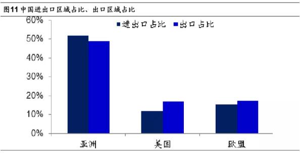 但好在我們的出口結(jié)構(gòu)已經(jīng)發(fā)生了一定的優(yōu)化,我們最大的外貿(mào)是在亞洲內(nèi)部,對亞洲的進(jìn)口和出口占比均約50%。而我們對美國和歐盟的出口占比約為34%,進(jìn)口占比約為20%。