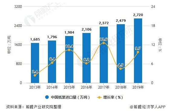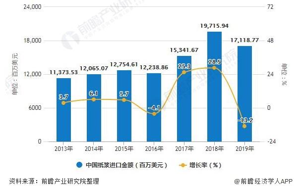2013-2019年中國紙漿進口金額統計及增長情況