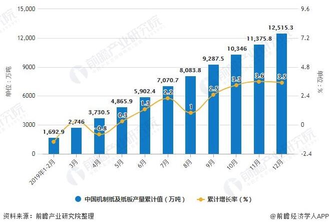 2019年1-12月中國機制紙及紙板產量累計值統計及增長情況