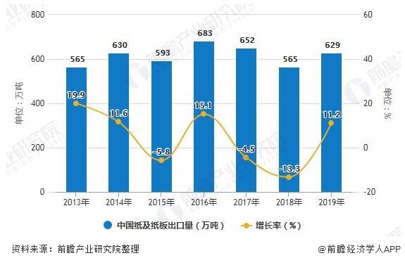 2013-2019年中國紙及紙板出口金額統計及增長情況