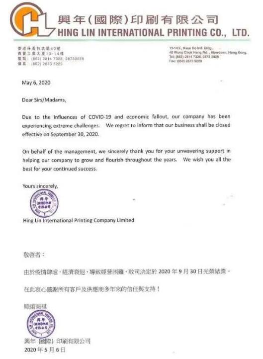 五一長假后的第一天,又一家老牌的港資印刷企業宣布結業了!新冠疫情引發的全球性經濟衰退,正將越來越多的人們甩離正常軌道,前浪失業了,后浪們何去何從? 近日,在珠三角享有盛譽的老牌港企興年印刷宣布光榮結業,導致這家在大陸穩健運營將近三十年的企業終止運營的原因是經濟原因和新冠疫情。