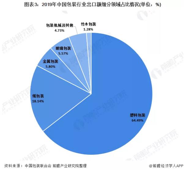 塑料包裝出口額最高,紙包裝居次位 從細分領域出口情況來看,塑料包裝完勝,紙包裝居第二。 塑料包裝完成累計出口額225.86億美元,占比64.49%;紙包裝完成累計出口額63.54億美元,占比18.14%;金屬包裝完成累計出口額20.3億美元,占比5.8%;玻璃包裝完成累計出口額19.51億美元,占比5.57%;包裝機械及其他完成累計出口額16.55億美元,占比4.73%;竹木包裝完成累計出口額4.48億美元,占比1.28%。