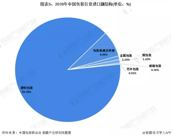 塑料包裝為主要進口產品 從進口產品構成來看,塑料包裝為主要進口產品。 2019年塑料包裝累計完成進口額125.48億美元,占進口總額的89.38%;包裝機械及其他完成累計進口額11.23億美元,占比8%;金屬包裝完成進口額1.61億美元,占比1.14%;紙包裝完成累計進口額1.55億美元,占比1.1%;玻璃包裝完成累計進口額0.51億美元,占比0.36%;竹木包裝完成進口額0.02億美元,占比0.01%。