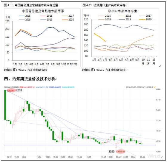 二、紙漿供應下降并不明顯 需求則維持低位 (一)供給階段性下降 但總量依然寬松 海外疫情出現至今,市場對資源國大宗商品供應減少的預期較強,但除了少數國家如南非錳礦發貨階段性下降外,澳洲、巴西等國商品出口較為穩定,鐵礦石發貨還增至年內高點。紙漿發運受影響并不明顯,從主要產漿國發運數據看,4月智利針葉漿出口中國11.2萬噸,環比增加72.99%,同比增加7.2%,闊葉漿出口13.33萬噸,環同比分別增加62%和45%。3月加針出口中國16.5萬噸,環同比分別減少17.9%和29.2%,加針3月減產比較明顯,4-5月檢修持續因此低供應或維持。巴西4月闊葉漿出口中國50.43萬噸,環比增加1.2%,同比小幅下降,從發貨量看巴西尚未受到疫情影響。美國3月出口中國針葉漿11.22萬噸,同比減少6.9%,環比增加3.4%。海關數據顯示,4月中國紙漿進口量251萬噸,環比減少6.2%,同比增加19.2%,4月進口量環比雖有回落依然較高,而木漿3月進口量未268萬噸,同比增幅較大。因此,海外需求減少將加劇中國木漿供應的壓力,后期若加針復產國內木漿累庫壓力也將增加。 (二)需求持續下滑 短期改善空間不大 海外疫情在3月以后開始加速擴散,對經濟活動影響也在加劇。4月國內疫情雖基本受控,復產復工加速,但從成品紙需求看,改善并不明顯,卓創資訊統計的數據顯示,銅版紙及雙膠紙價格下跌700元和300元,白卡紙價格也下跌300元/噸,經銷商及紙企以消化庫存為主,銅版紙訂單下降,紙廠開始減產。雙膠紙方面,學校開學出版社進行招標,但競爭較為激烈,下游印廠對原紙采購并不積極。從統計局數據看,3月中國機制紙產量為1045.6萬噸,同比減少0.15%,考慮到4-5月銅版紙減產,預計紙產量也將回落。生活用紙疫情期間表現較好,但進入4月價格開始回調,市場疲態盡顯,漿價下跌后紙廠盈利情況較好,因此5月預計仍有下跌空間,紙廠也意圖通過降價增加出貨。 海外紙廠受疫情影響停產增加,Domtar決定自5月5日起對Hawesville工廠采取減產措施,預計減少83,000噸未涂布印刷書寫紙供應,復產時間預計在6月和8月,4月6日Domtar已關停了旗下Kingsport和Ashdown兩家紙廠,計劃停產3個月,預計減少未涂布文化紙144,000噸。21日Sappi Europe暫停了比利時Lanaken紙漿和造紙廠7號紙機,以應對印刷紙需求下降,持續時間未知。20日加拿大Paper Excellence將不列顛兩家造紙廠的停產時間延長至夏季中旬。 綜合看,4月由于國外疫情進入高峰,成品紙需求下滑的壓力增加,紙廠檢修停產導致木漿需求下降,隨著歐洲疫情見到拐點并加速復工,情況或有改善,但防控壓力仍在,因此需求很難快速回升,同時美國及新興國家疫情依然嚴峻,因此中國以外地區成品紙及木漿需求在5-6月環比改善空間有限。國內需求逐步釋放,但6月文化紙及白卡將迎來淡季,不應過于樂觀。 三、庫存環比回落 但主動去庫或將持續 國內主要港口4月木漿庫存繼續回落,4月底青島港(601298,股吧)及常熟港庫存總量為163萬噸,環比減少21萬噸,同比增加7萬噸,相比年后高點下降34萬噸,國內庫存仍在高位。歐洲3月港口木漿庫存總量降至136.8萬噸,環比減少16.3萬噸,同比減少64.1萬噸,相比國內歐洲庫存降幅明顯,已接近歷史正常區間。歐洲庫存減少或源自需求下降后,發往中國的木漿增加,全球生產商闊葉漿庫存再次大幅回升,加針供應階段性減少,但長期維持低位的可能不大,而美國及歐洲木漿發貨正常,因此5月國內木漿庫存貨再次增加。從庫存周期看,疫情發生前主動去庫已接近尾聲,開始向主動補庫過度,但疫情打亂了造紙行業的庫存周期,木漿在二季度或進入被動補庫及主動去庫階段,漿價上漲面臨壓力。