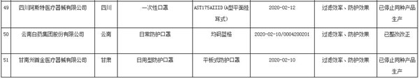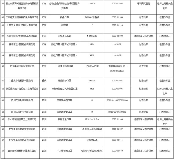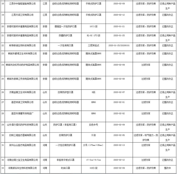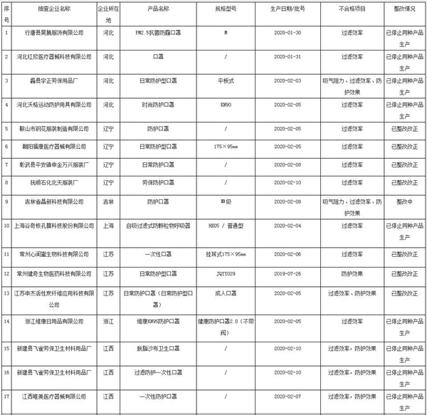 非醫(yī)用口罩質(zhì)量監(jiān)督抽查不合格批次名單