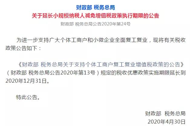 國家稅務總局發布,為進一步支持廣大個體工商戶和小微企業全面復工復業,《財政部 稅務總局關于支持個體工商戶復工復業增值稅政策的公告》(財政部 稅務總局公告2020年第13號)規定的稅收優惠政策實施期限延長到2020年12月31日。