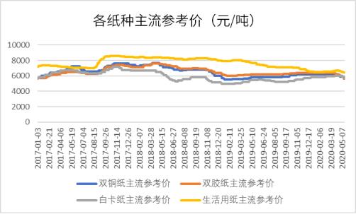 圖5.各紙種主流參考價(jià)4月下旬以來(lái)持續(xù)下降 從開工情況來(lái)看, 3月份白卡紙生產(chǎn)企業(yè)開工負(fù)荷率與2月持平,較去年同期減少6個(gè)百分點(diǎn)。3月月度產(chǎn)量較2月增加3.57%。4月份國(guó)內(nèi)生活用紙裝置整體開工負(fù)荷率變化不大,較3月下滑0.19個(gè)百分點(diǎn)。開工變化不大的原因?yàn)椋旱谝唬? 月份紙企陸續(xù)恢復(fù)正常開工,本月開工情況不多;第二,原紙市場(chǎng)供應(yīng)量開始增多;第三,安全衛(wèi)生事件影響,新增產(chǎn)線偏少。 文化用紙方面,4 月份銅版紙生產(chǎn)企業(yè)開工負(fù)荷率較3月下調(diào)8.13 個(gè)百分點(diǎn),銅版紙規(guī)模紙廠紛紛減產(chǎn),轉(zhuǎn)產(chǎn)力度加大,產(chǎn)量減少,開工負(fù)荷率下滑。雙膠紙生產(chǎn)企業(yè)開工負(fù)荷率較3 月下滑1.19 個(gè)百分點(diǎn)。部分規(guī)模紙廠轉(zhuǎn)產(chǎn),雙膠紙市場(chǎng)供應(yīng)壓力加大,加之下游需求支撐不足,供需矛盾較為明顯,多數(shù)廠家生產(chǎn)不積極?傮w來(lái)看,4月下游紙種排產(chǎn)相對(duì)平穩(wěn),但因紙價(jià)跌勢(shì)難掩,紙廠原料采買積極性偏低,預(yù)計(jì)短期紙漿消耗速度仍有減緩可能,建議持續(xù)關(guān)注紙廠備貨策略的變動(dòng)。