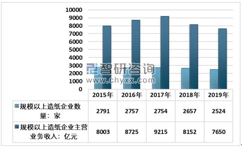 據(jù)國家統(tǒng)計局統(tǒng)計的2524家造紙生產(chǎn)企業(yè),2019年1-12月主營業(yè)務(wù)收入7650億元;受利潤總額下降的影響,國內(nèi)規(guī)模以上造紙企業(yè)數(shù)量近些年處于下降趨勢。在統(tǒng)計的2524家造紙生產(chǎn)企業(yè)中,虧損企業(yè)有560家,占22.19%。 2015-2019年中國規(guī)模以上造紙企業(yè)數(shù)量及主營業(yè)務(wù)收入情況