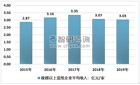 資料來源:國家統(tǒng)計局、智研咨詢整理 2017年,我國規(guī)模以上造紙企業(yè)主營業(yè)務(wù)平均收入達(dá)到峰值的3.35億元/家,隨后兩年開始不同程度的下降,截至2019年,國內(nèi)規(guī)模以上造紙企業(yè)主營業(yè)務(wù)平均收入下降至3.03億元/家。 2015-2019年中國規(guī)模以上造紙企業(yè)平均收入走勢圖