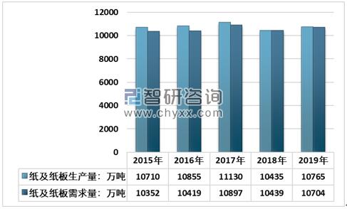 2019年全國紙及紙板生產(chǎn)量10765萬噸,相比2018年的10435萬噸,增長3.16%。消費(fèi)量10704萬噸,同比增長2.54%。 2015-2019年中國紙及紙板生產(chǎn)和消費(fèi)情況
