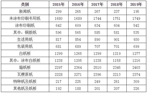 2019年新聞紙生產(chǎn)量150萬噸,較上年下降21.05%;未涂布印刷書寫紙生產(chǎn)量1780萬噸,較上年增長1.71%;涂布印刷紙生產(chǎn)量680萬噸,較上年下降3.55%;銅版紙生產(chǎn)量630萬噸,較上年下降3.82%;生活用紙生產(chǎn)量1005萬噸,較上年增長3.61%;包裝用紙生產(chǎn)量695萬噸,較上年增長0.72%;白紙板生產(chǎn)量1410萬噸,較上年增長5.62%;其中,涂布白紙板生產(chǎn)量1350萬噸,較上年增長5.88%。箱紙板生產(chǎn)量2190萬噸,較上年增長2.10%;瓦楞原紙生產(chǎn)量2220萬噸,較上年增長5.46%;特種紙及紙板生產(chǎn)量380萬噸,較上年增長18.75%。 2015-2019年中國紙及紙張細(xì)分產(chǎn)品生產(chǎn)情況單位:萬噸
