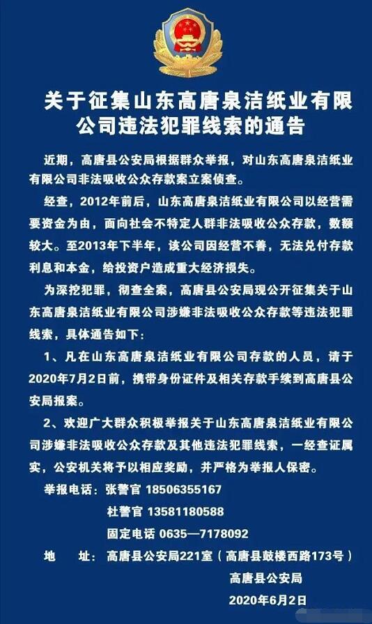 為深挖犯罪,徹查全案,高唐縣公安局公開征集關于山東高唐泉潔紙業(yè)有限公司涉嫌非法吸收公眾存款等違法犯罪線索。凡在山東高唐泉潔紙業(yè)有限公司存款的人員,請于2020年7月2日前,攜帶身份證件及相關存款手續(xù)到高唐縣公安局報案。