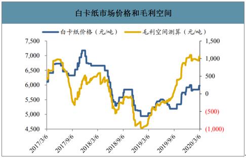 價格方面,2017年造紙行業景氣度回升,白卡紙價格跟隨上漲,但2018年5月起龍頭企業紛紛搶占市場份額,行業競爭加劇,疊加宏觀經濟環境影響,白卡紙價格快速下跌,2018年7月小幅回調后,11月再次回落,2019年1月跌破5000元/噸,2019年3月后白卡紙價格開始觸底反彈,毛利也在2019年大幅增長。 白卡紙市場價格和毛利空間