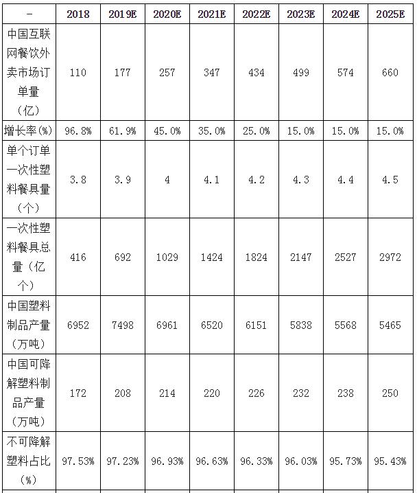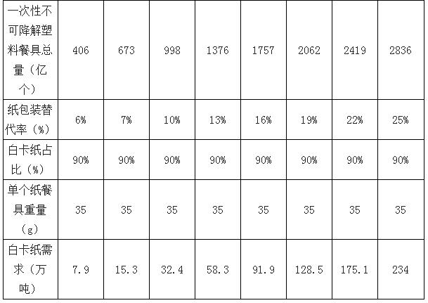 二、2025年白卡紙需求規模預測 根據國家標準《國家食品安全標準食品接觸用紙和紙板材料及制品》,食品級包裝用紙必須使用原生木漿為原料,完全采用原生木漿的食品包裝用紙不存在受污染的風險,可安全接觸食品,不會將有害成分轉移到食品上。因此,在餐飲外賣使用的餐盒、與食品接觸的紙袋等領域,白卡紙是可選擇的替代路線之一。《治理意見》的出臺,將在一定程度上帶來白卡紙需求量的上升,外賣餐盒和零售紙袋使用頻率的上升會加速白卡紙市場價格回升。 2025年白卡紙替代餐飲外賣領域一次性塑料餐具規模有望達到234萬噸。預計截至2025年中國一次性塑料餐具使用總量將達2972億個。由于《關于進一步加強塑料污染治理的意見》將一次性塑料餐具限制在不可降解范圍內,預測2025年中國不可降解一次性塑料餐具使用總量為2836億個。《關于進一步加強塑料污染治理的意見》中提出截至2025年底地級以上城市餐飲外賣領域不可降解一次性塑料餐具消耗強度下降30%,預計2025年白卡紙替代餐飲外賣領域一次性塑料餐具的需求規模為234萬噸。 白卡紙替代餐飲外賣領域一次性塑料餐具規模預測