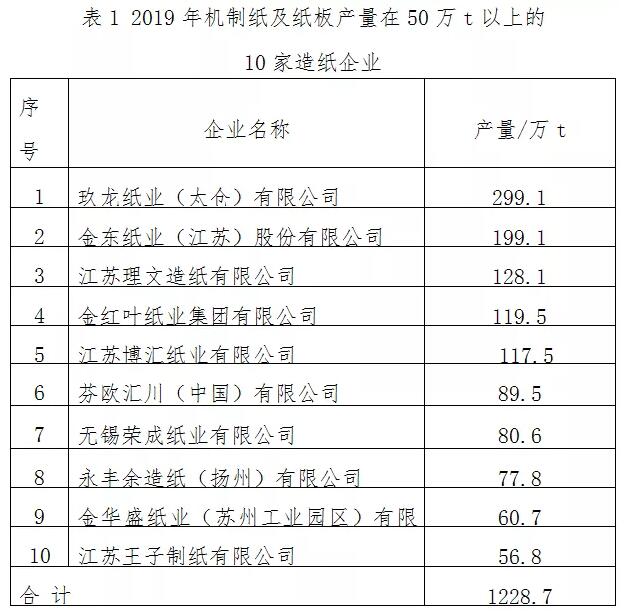 2019年,面對宏觀經濟增速放緩、中美貿易爭端加劇、環保持續趨嚴和原料供給端擴張與需求端收縮等多重壓力,江蘇省造紙工業經營發展也面臨著巨大壓力,但在逆境中江蘇省紙及紙板總產量增幅顯著。 1、2019年生產運營情況 1.1主要生產經濟指標完成情況 1.1.1 機制紙及紙板總產量 據江蘇省造紙行業協會調查統計,2019年江蘇省造紙工業累計生產機制紙及紙板總產量達到1473萬t,比2018年的1321萬t增加11.5%。 1.1.2 主要紙種產量 (1)文化用紙 2019年江蘇省文化用紙總產量為408.1萬t,占江蘇省機制紙及紙板總產量的27.7%,比2018年的381.4萬t增加7.0%。 其中:銅版紙產量244.8萬t,比2018年的239.7萬t增加2.1%;雙膠紙和復印紙原紙產量163.3萬t,比2018年的141.7萬t增加15.2%。 。2)包裝用紙及紙板 2019年江蘇省包裝用紙及紙板總產量為899.4萬t,占江蘇省機制紙及紙板總產量的61.1%,比2018年的768.6萬t增加17.0%。 其中:瓦楞原紙產量295.8萬t,比2018年的255.8萬t增加15.6%;箱紙板產量405.9萬t,比2018年的371.0萬t增加9.4%;涂布白紙板產量78.7萬t,比2018年的60.8萬t增加29.4%;紙管原紙產量0.9萬t,較2018年的6.4萬t減少86.0%;涂布白卡紙產量117.5萬t,比2018年的76.4萬t增加53.8%。 (3)生活用紙 2019年江蘇省生活用紙總產量為149.2萬t,占江蘇省機制紙及紙板總產量的10.1%,比2018年的145.0萬t增加2.9%。 。4)特種紙及紙板 2019年江蘇省特種紙及紙板總產量為16.3萬t,包括無碳復寫紙、防偽票證紙、熱敏紙、紙杯原紙、三濾紙、蚊香片紙、箱包紙板、鞋底紙板等,占江蘇省機制紙及紙板總產量的1.1%,比2018年的26.0萬t減少37.3%。 1.1.3 纖維原料結構 2019年江蘇省紙漿總消耗量1156萬t,比2018年的1057萬t增加9.4%。江蘇省木漿、廢紙漿、非木漿占比分別為38.2%、61.0%、0.8%。 其中:木漿消耗量442萬t,比2018年的422萬t增加4.7%;占紙漿總消耗量的38.2%,比2018年的39.9%減少了1.7個百分點。 廢紙漿消耗量705萬t,比2018年的630萬t增加11.9%;占紙漿總消耗量的61.0%,比2018年的59.6%增加了1.4個百分點,折合耗用廢紙881萬t。 非木漿消耗量9萬t,比2018年的5萬t增加80%;占紙漿總消耗量的0.8%,比2018年的0.5%增加了0.3個百分點。 1.1.4 實現產值、銷售收入、稅金及利潤 據江蘇省造紙行業協會統計,2019年江蘇省造紙工業總計完成工業總產值684億元,比2018年的690億元降低0.9%;實現銷售收入687億元,比2018年的693億元降低0.9%;上繳稅金25億元,比2018年的27億元降低7.4%;實現利潤62.5億元,比2018年的58.0億元增長7.8%;江蘇省虧損制漿造紙企業共5家。 1.2 區域產量分布情況 2019年,蘇南地區造紙總產量合計1070萬t,占江蘇省造紙總產量的72.6%,比上年同期的1002萬t增加6.8%;蘇中地區造紙總產量合計133萬t,占江蘇省造紙總產量的9.0%,比上年同期的112萬t增加18.8%;蘇北地區造紙總產量合計270萬t,占江蘇省造紙總產量的18.4%,比上年同期的207萬t增加了30.4%。主要原因是近年來蘇北地區一些新建生產包裝用紙的造紙企業產能釋放,未來還會有新的產能落戶蘇北(APP如東項目及江蘇鹽城鳳程紙業年產55萬t瓦楞原紙等項目),對江蘇造紙產能的均勻分布起到一定的影響。 1.3 內、外(合)資企業產量比重 2019年江蘇省內資造紙企業產量合計373.1萬t,占江蘇省機制紙及紙板總產量的25.3%,比2018年的21.9%增加了3.4個百分點,產量比2018年的289.0萬t增加29.1%,內資企業產量大幅提高的原因在于江蘇鹽城、連云港、宿遷一帶新興的造紙產能逐步釋放,導致內資企業比重加大;江蘇省外(合)資企業產量合計1099.9萬t,占江蘇省機制紙及紙板總產量的74.7%,比2018年的78.1%減少了3.4個百分點,產量比2018年的1062.0萬t增加3.6%,這是部分大型造紙企業產量提升產能波動引起的。 1.4 大中型造紙企業的市場份額繼續擴大 國家環保政策對落后產能的淘汰力度逐步加大,小型造紙企業在多方面都處于劣勢,盈利困難,2019年至今減產、停產現象較為普遍。10萬t以上的大中型造紙企業2019年合計產量達到1397萬t,占江蘇省造紙總產量的94.8%,比2018年的1262萬t增加10.7%。其中,年產量50萬t以上的大型造紙企業2019年合計產量達到1172萬t,占江蘇省造紙總產量的79.6%,比2018年1062萬t增加10.3%;2019年江蘇省大中型造紙企業的平均規模達到69.9萬t,與2018年的70萬t基本持平。 1.5 規模企業概況 2019年機制紙及紙板產量達到10萬t的造紙企業共20家,產量在50萬t以上的企業有10家(見表1)。